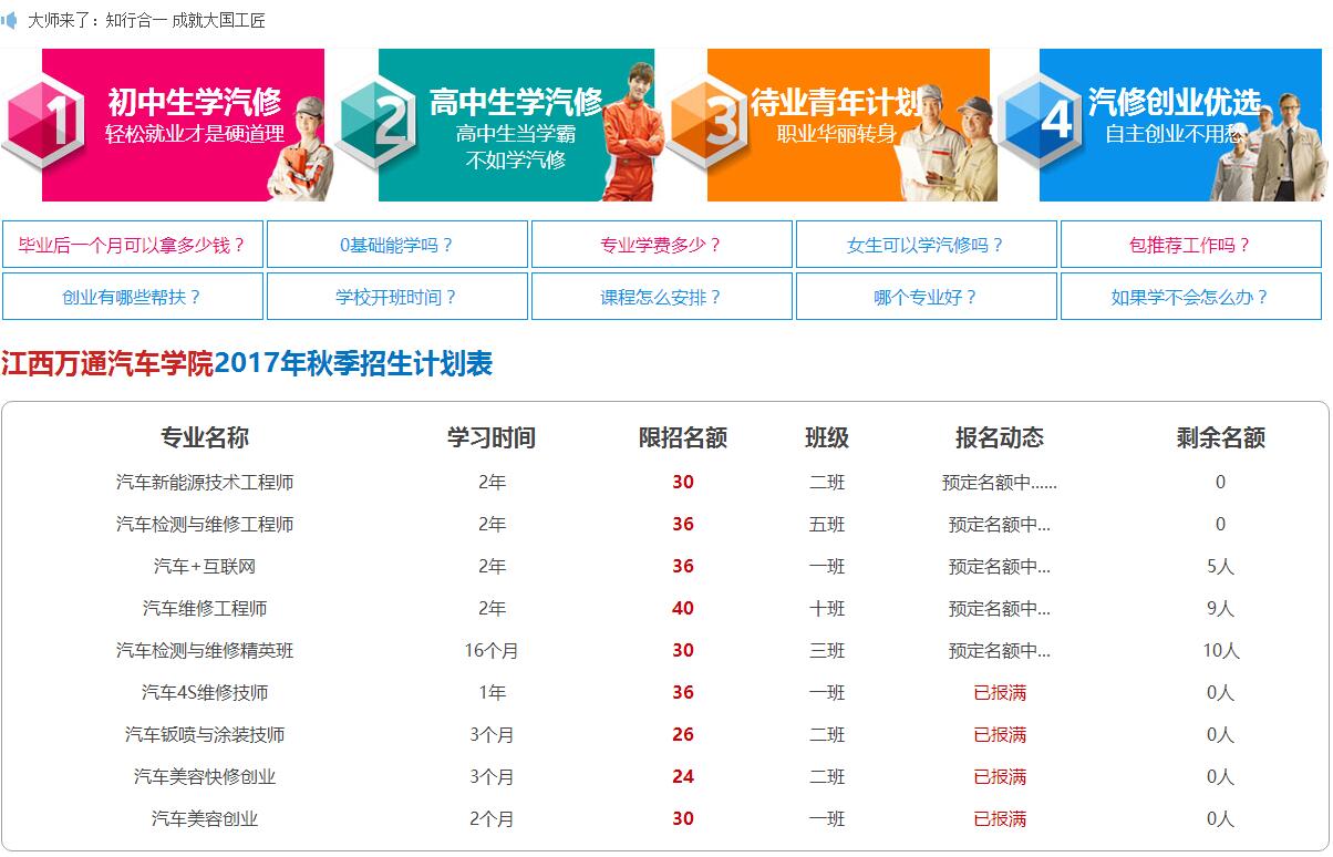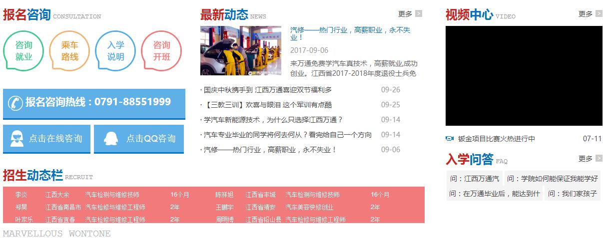江西萬通汽車學(xué)院是汽修技術(shù)人才培養(yǎng)基地、全國汽車行業(yè)示范職教單位、汽車行業(yè)協(xié)會理事會員單位、汽修教育院校。學(xué)校位于江西省南昌市。教學(xué)樓、實訓(xùn)樓、學(xué)生公寓、多功能體育活動中心等基礎(chǔ)設(shè)施一應(yīng)俱全,并建有高等轎車檢測中心 、電控實訓(xùn)廳、整車實訓(xùn)廳、電器實訓(xùn)廳、四輪定位實訓(xùn)廳、汽車美容實訓(xùn)廳、多媒體網(wǎng)絡(luò)中心等現(xiàn)代實驗、實訓(xùn)廳等50余間,為滿足學(xué)生實踐動手操作的需要,學(xué)校擁有中、美、德、日、韓等五大車系100余部各品牌汽車供學(xué)子實戰(zhàn) 、實訓(xùn)。其中,校園汽車4S模擬教學(xué)基地和汽車美容創(chuàng)業(yè)項目示范中心領(lǐng)跑國內(nèi)職業(yè)教育。