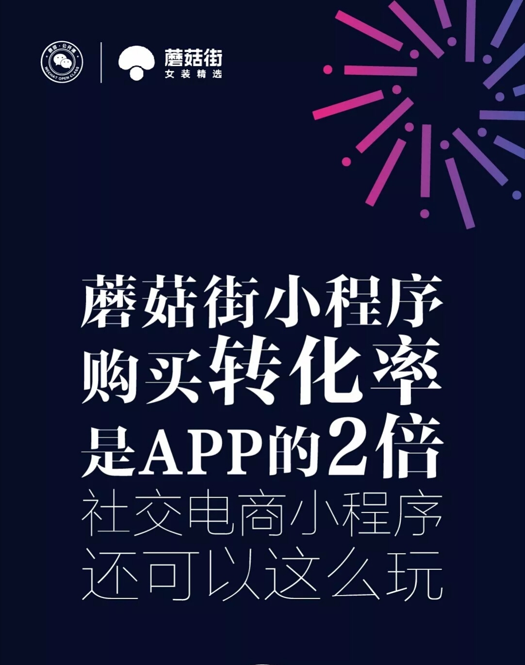 蘑菇街在小程序上大量使用優(yōu)惠券、立減金刺激用戶轉(zhuǎn)化和社交傳播。加上“直播”、“拼團(tuán)”,形成小程序“三駕馬車”,一個半月,新客數(shù)量就突破300萬,購買轉(zhuǎn)化率是APP的2倍。
