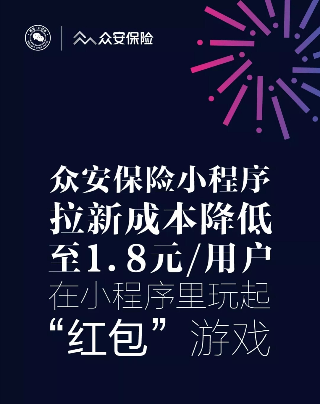 眾安保險小程序就在小程序里玩起了“紅包”游戲,選擇最具不確定性的“延誤險”為切入口,每延誤30分鐘,購買延誤險的用戶就能收到1個延誤紅包,紅包大大的引發(fā)了用戶的轉(zhuǎn)發(fā)興趣。除此,用戶在購買保險后可獲得“立減金”,分享后就可以收到金額不等的現(xiàn)金,這一系列玩法,讓眾安保險交易用戶的拉新成本降到不可思議的1.8元/人。