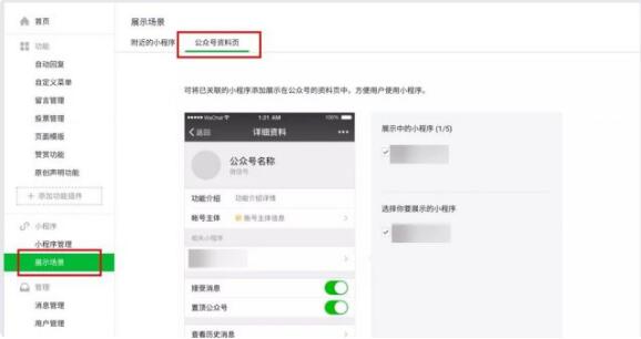 點擊左側(cè)邊欄中的「展示場景」,并選擇頁面頂部的「公眾號資料頁」。