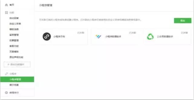 管理者可通過(guò):公眾號(hào)管理后臺(tái)-小程序-小程序管理,繼續(xù)添加關(guān)聯(lián)小程序。