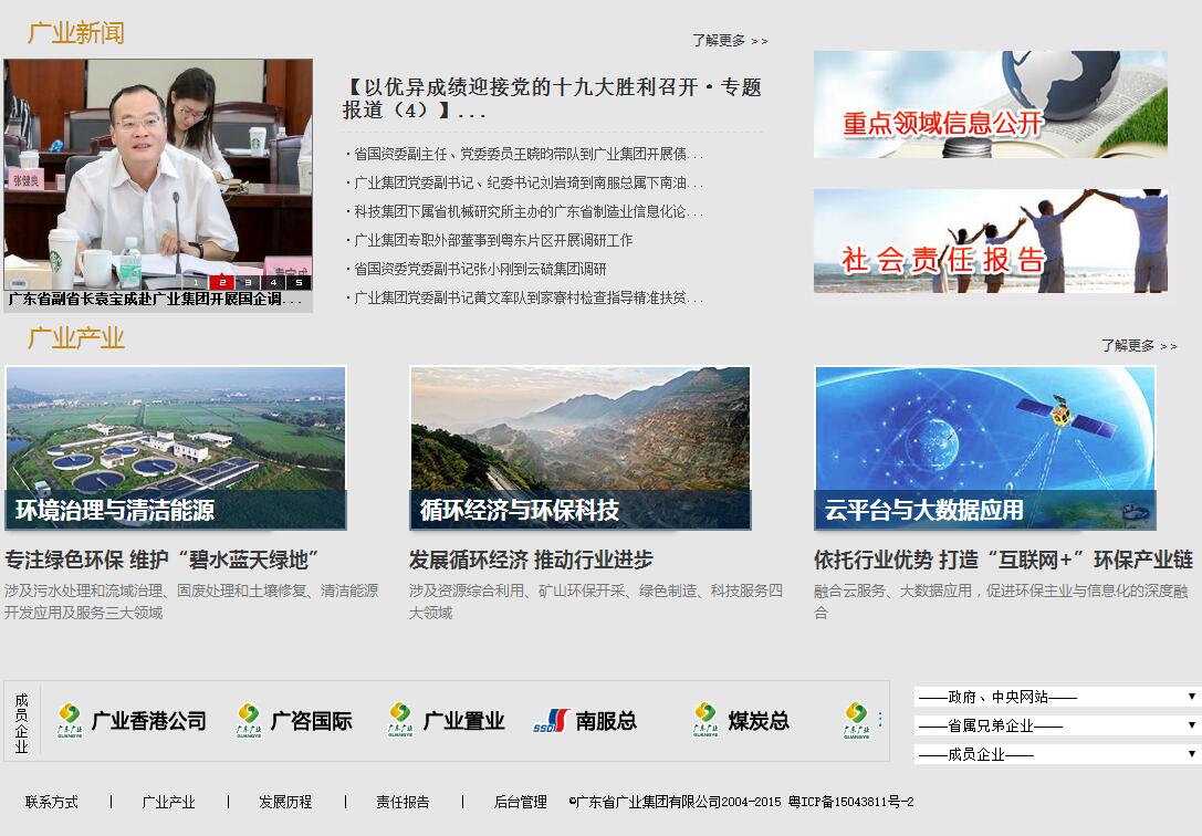 廣業(yè)集團始終專注于綠色環(huán)保領(lǐng)域,以維護廣東“碧水藍天綠地”為己任,形成了綠色環(huán)保產(chǎn)業(yè)“兩大門類七大領(lǐng)域”的業(yè)務(wù)格局,突出發(fā)展環(huán)境治理與清潔能源、循環(huán)經(jīng)濟與環(huán)??萍贾鳂I(yè),并積極培育“云平臺與大數(shù)據(jù)應(yīng)用”業(yè)務(wù)。目前控股貴糖股份(證券代碼:000833)、宏大爆破(證券代碼:002683)、廣咨國際(證券代碼:836892)三家上市公眾公司,擁有“廣業(yè)環(huán)保、“云硫”、“南聯(lián)”三個廣東省十佳自主品牌。2014年,公司位居中國企業(yè)500強第388位、廣東大型企業(yè)競爭力50強第28位、廣東省50家自主創(chuàng)新標桿企業(yè)第一位;2015年,公司位居廣東省企業(yè)500強第61位、廣東省服務(wù)業(yè)百強第19位,榮獲“廣東省自主創(chuàng)新工作優(yōu)秀組織單位”稱號;2016年,公司位居廣東省企業(yè)500強第73位、廣東省服務(wù)業(yè)百強第25位。