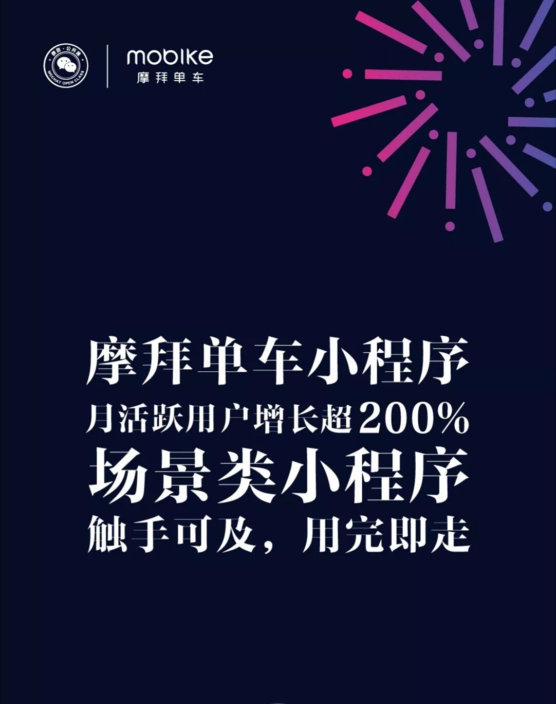 摩拜將小程序的各種能力作為企業(yè)運營的利器。掃一掃、紅包、立減金一個也不能少。在摩拜全面入駐微信之后,月活躍用戶量環(huán)比增長超200%,每日注冊用戶超過50%來自小程序。